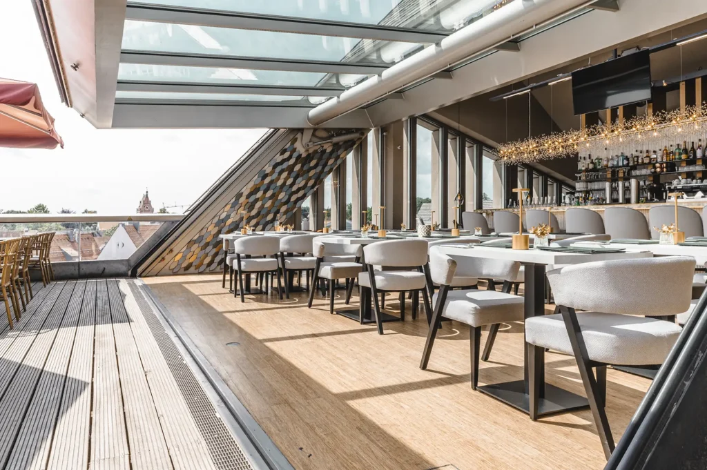 Spritz, Bier, Longdrinks, Zero-Alcohol, starke Klassiker und ROOF Signatures – plus Kaffee-Spezialitäten und Tee. Tipp: Espresso Martini für den eleganten Ausklang. Happy Hour täglich 18–20 Uhr.